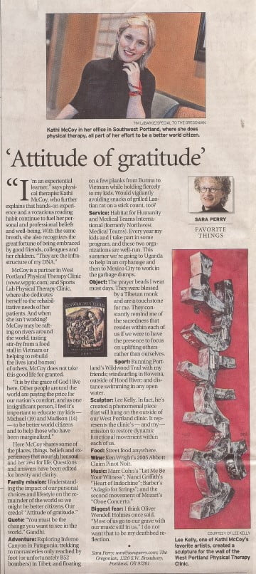The Oregonian featured Kathi, who shared some of her thoughts on places, things, beliefs and experiences with Oregonian writer Sara Perry. The complete text of Perry’s “Favorite Things” article may be viewed by clicking the links below.